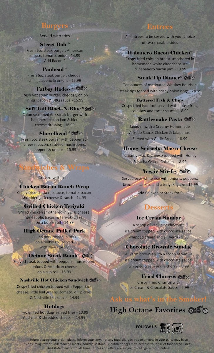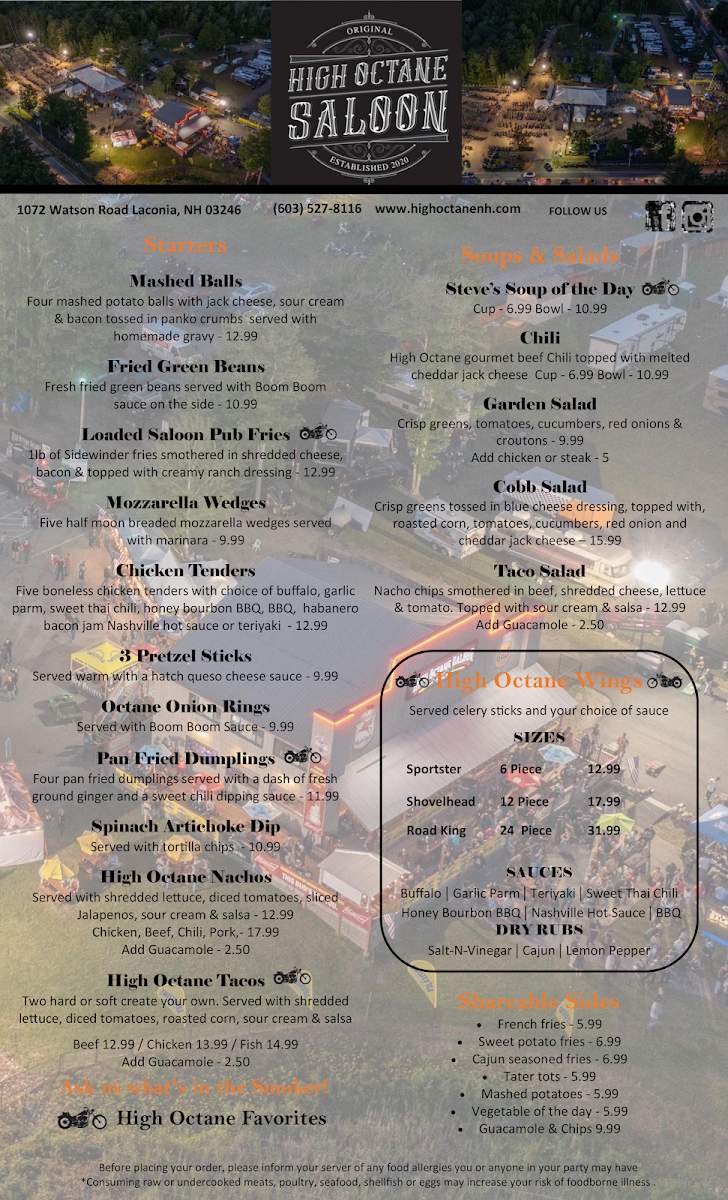 Welcome to High Octane Saloon, the vibrant hub where flavor meets fun in Laconia, NH. Nestled at 1072 Watson Rd, this unique establishment combines a rustic saloon atmosphere with mouthwatering culinary delights. The menu proudly features a selection of indulgent burgers, like the Shovelhead Burger with pepper jack cheese and bacon, or the fiery Soft Tail BlackNBlue Burger with habanero bacon jam.